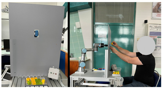 The first scenario consisted of a basic workstation, as shown in Figure 2. In the second experiment scenario, we added a barrier to the CW, as shown in Figure 4. The barrier prevented visual contact between the human and the CR and made it impossible to monitor the CR’s movement and speed. By changing the CW layout and splitting the experiment into two scenarios, we aimed to investigate how the ability or inability to monitor the movements of the CR affects the worker’s efficiency. In our study, worker efficiency was measured as the time needed by a worker to conduct the previously described collaborative assembly operation.