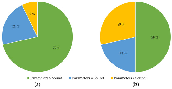 The pie chart in Figure 5a shows the proportion of participants who achieved the shortest average assembly time in each combination of CR motion parameters and sound levels while working at the CW without the barrier. The pie chart in Figure 5b differs from the pie chart in Figure 5a only in that the results shown are from the second scenario, where participants worked at the CW with the barrier.