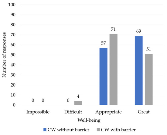 When comparing the scenarios, we can see that there were 18 more responses for “Great” in the scenario without the barrier than in the scenario with the barrier. Also, in the scenario without the barrier, no response for “Difficult” was obtained, whereas in the scenario with the barrier, there were four such responses. Based on the results shown in Figure 6, in the scenario with the barrier, the participants’ well-being started to decrease compared with the scenario without a barrier, which confirms that working with the CR without the barrier might be more suitable for workers. As we have already indicated in the previous analysis, visualization might play an important role in the HRC. Nevertheless, the distribution of responses requires further statistical testing to confirm our assumption.