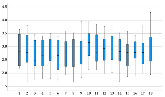 The three-way RM ANOVA had to be carried out to confirm the previous findings. The first step was to check if all of the assumptions were met. The study design satisfied the first two assumptions inherently. The dependent variable, mean assembly time, was continuous, and there were three distinct factors: barrier (2 levels), CR motion parameter (3 levels), and CR sound level (3 levels). Box plots were utilized to verify the absence of significant outliers. Table 5 lists the order of experiment runs and the corresponding combinations of motion parameters, sound levels, and barrier use.