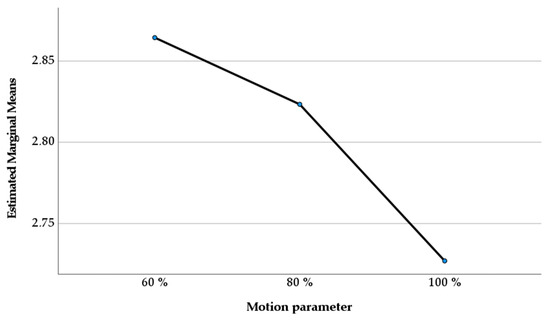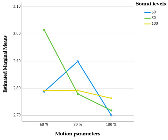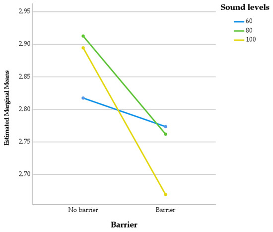 Factors where the significance value of the Mauchly’s test is greater than 0.05 indicate that the assumption of sphericity has been met, and if the significance value is less than 0.05, this indicates a violation of this assumption, and a Greenhouse–Geisser correction should be used instead [28,29]. If the factor has only two levels (in our case, “barrier”), the assumption of sphericity is fulfilled automatically. Table 6 also shows that the assumption of sphericity was satisfied for sound level and the interaction terms barrier × motion parameter, barrier × sound level, and motion parameter × sound level, but violated for motion parameter and the three-way interaction barrier × motion parameter × sound level.