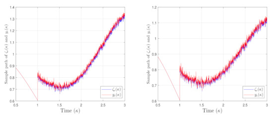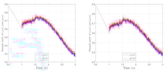Now, we present a numerical simulation of Equations (44) and (46), initialized with the condition , while employing the selected parameters and . Subsequently, in Figure 1 and Figure 2, we offer a comparative analysis between the precise solution for Equation (44) and the averaged solution for Equation (46), each evaluated for two distinct values of .