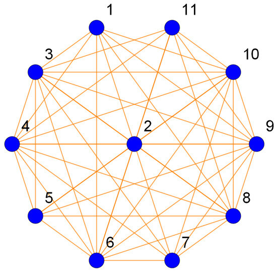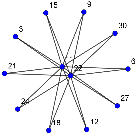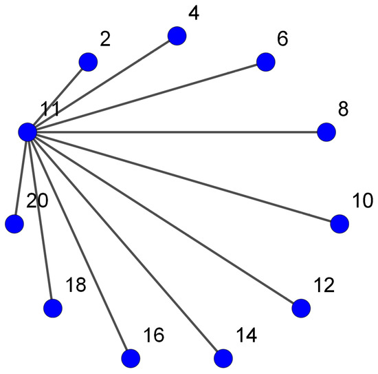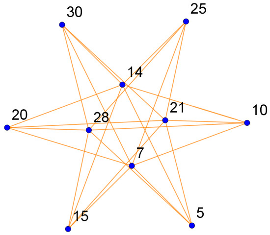 For illustration, let us take . Then, the zero-divisor graph is shown in Figure 4.