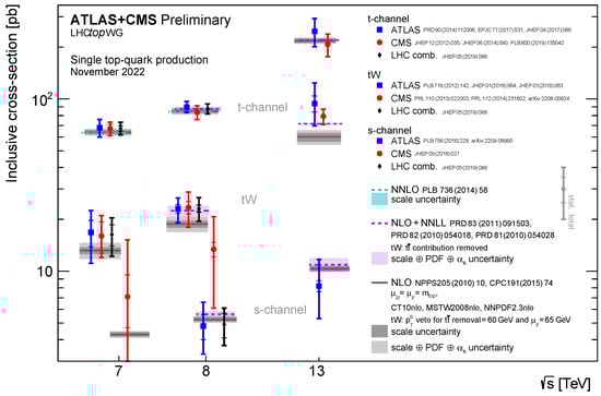 - Aaboud, M.; Aad, G.; Abbott, B.; Abbott, D.C.; Abdinov, O.; Abed Abud, A.; Abhayasinghe, D.K.; Abidi, S.H.; AbouZeid, O.S.; Abraham, O.S.; et al. Combinations of single-top-quark production cross-section measurements and |fLVVtb| determinations at = 7 and 8 TeV with the ATLAS and CMS experiments. J. High Energy Phys. 2019, 5, 88. [Google Scholar] [CrossRef]