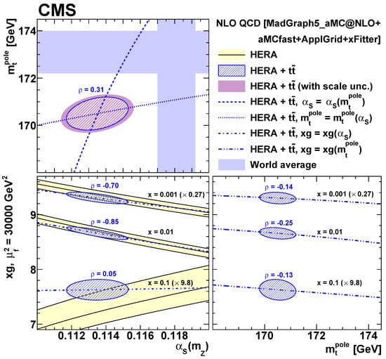 - Sirunyan, A.M.; Tumasyan, A.; Adam, W.; Ambrogi, F.; Bergauer, T.; Brandstetter, J.; Dragicevic, M.; Escalante Del Valle, A.; Flechl, M.; Fruehwirth, R.; et al. Measurement of normalised multi-differential cross sections in pp collisions at = 13 TeV, and simultaneous determination of the strong coupling strength, top quark pole mass, and parton distribution functions. Eur. Phys. J. C 2020, 80, 658. [Google Scholar] [CrossRef]