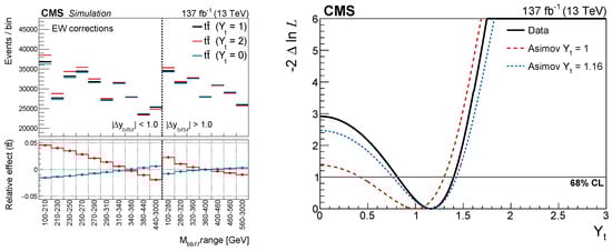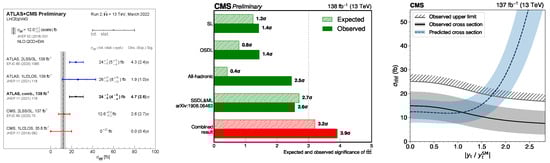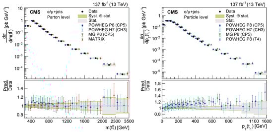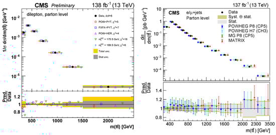 These techniques have been pioneered at the Tevatron but, owing to the limited amount of statistics, in a one-dimensional approach as a top quark pole mass extractions only, using NNLO+NNLL pQCD calculations [96]. Nowadays, double- and even triple-differential cross-section measurements at the LHC [95] in the dilepton and jets decay channels (see Figure 4) provide excellent statistical power and (multi)differential information to constrain SM parameters and PDFs when compared to state-of-the-art predictions up to NNLO+NNLL [66,97]. In the context of the “TOP 2022 conference,” CMS has presented the first measurement of the production cross-section at 13.6 TeV [89].
