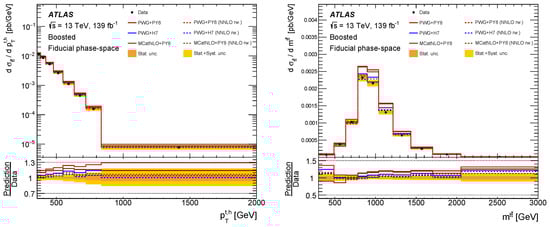 Measurements of production in the boosted regime give access to high-scale contributions, possibly affected more strongly by BSM processes through virtual or loop contributions. In addition, the boosted phase space can also give alternative access to SM quantities by comparing measurements with predictions and explicitly exploiting one of the features of boosted top quarks, with a lower contribution from threshold effects. Experimentally, boosted top quarks are challenging and require dedicated “top quark taggers” to retain reconstruction efficiency because these highly boosted top quarks result in collimated decay products that are either partially or fully merged. For example, boosted top quark events where the lepton (muon or electron) appears as non-isolated due to its proximity to the b-jet. Dedicated algorithms for jet and lepton cleaning at the trigger and analysis level allows reconstructing the decay products of events in the jets channel even without requiring isolation for the leptons. The other top quark in those events decays hadronically, and the decay products have angular distances that are smaller than the jet clustering distance parameter. Hence, all those decay products are reconstructed into a single jet, or “boosted” topology. However, when the pair is produced near the production threshold, every decay product ends up in a single jet or “semi-resolved” topology, and with a rising boost, the hadronic W boson decay products get merged first, which represents the “semi-resolved” topology. The first step in extending measurements into the highly boosted phase space is dedicated measurements in the boosted phase space to establish reconstruction methods [101] (Figure 6).