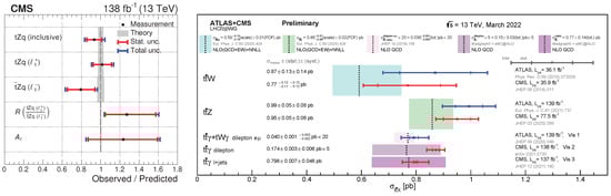 Historically, the single top quark production was first observed at the Tevatron in 2009 in the t-channel production mode [73,74] and the program culminated in a simultaneous measurement of the s- and t-channel electroweak single top-quark production cross-sections using three multivariate analyses to separate the signal from the background. At D0, these three methods were combined in order to measure the s-, t- and -channel cross-sections in one analysis [75], which was later combined with CDF to form the legacy single top quark cross-section measurements at the Tevatron [76]. This includes the s-channel single top quark production, which has been observed in the combination of earlier results by CDF and D0 [76]. With the start of the operations of the LHC, it was certain that the LHC is not just a top quark factory based on pair production alone, but that it is also producing an abundance of events containing single top quark events. The larger production cross-section allowed for, at first, more straightforward techniques [77,78], with a selection mostly relying on two leptons, one from top-W boson decay, one from “direct” W boson decay, while lately, the application of MVA techniques in LHC measurements allows for one of the W bosons to decay hadronically, e.g., for a “single lepton” tW channel with decent signal-to-background fraction. The most up-to-date measurements at the LHC are by CMS in the t-channel using 13 TeV data and by ATLAS also in the t-channel but using 8 TeV data [45,79]. Figure 1 shows the current situation of measurements of the inclusive single top quark production cross-sections at the LHC [80,81,82,83,84] for all production channels, including combinations of ATLAS and CMS data. Most recently, ATLAS has seen evidence for the production of single top quarks in the s-channel [84]. However, as mentioned earlier the s-channel is challenging at the LHC and hence, is the least well-measured process in -collisions.