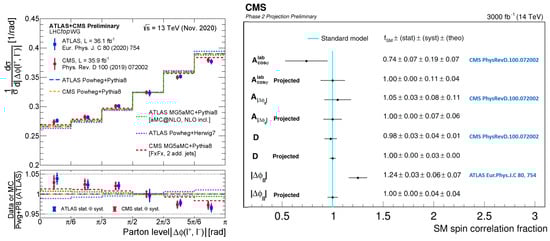 Left: Independent measurements of the opening angle between the decay leptons of the pair are compared to SM predictions [116,118]. Right: A projection of the expected precision of the spin correlation and polarization of top quarks at the HL-LHC [121].