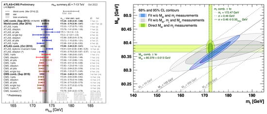 Figure 12 (right) shows the versus plane, where is obtained by the GFitter collaboration [16] via a combination of the individual combined results of ATLAS and CMS using direct methods—an updated result including latest measurements can be found at Ref. [131]. That combined and its uncertainty gets an additional theoretical uncertainty of 500 MeV assigned to account for a potential difference between the measured “MC mass” and the pole mass of the top quark. Historically, and surely since the early measurements at the Tevatron got reasonably precise, this MC-versus-pole-mass controversy has received lots of attention from the experimental and theoretical communities. Given the increasing precision of the LHC measurements beyond 0.3%, the topic receives renewed attention, asking for an accurate assessment of the differences and uncertainties related to this conversion, a recent overview article is provided in Ref. [132]. The value of is the world average of available measurements at the time of this fit. A recent update on the W boson mass measurement by CDF [133] is further away from the world average, and the result and its impact are currently being discussed in the community [131]. Together with the measurement of the mass of the Higgs boson [10,11] this is a strong self-consistency test of the SM with implications on the stability of the SM vacuum [20]. The current measurements and the theoretical extrapolation at NNLO of the SM seem to indicate that the vacuum is meta-stable or, maybe even more peculiar, sitting right at the boundary of stability and meta-stability.