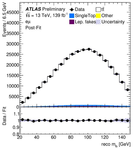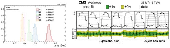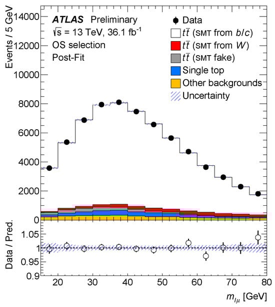 Even more orthogonal measurements using alternative approaches to measuring the top quark mass employ, for example, the invariant mass of the muon from the leptonic decay of the W boson together with a soft muon in the b jet as a top-mass sensitive observable [135]. Given the dependency on muons, this measurement approach is less sensitive to uncertainties and effects that arise from jet energy scale and top quark production modeling. However, since the soft muon comes from the decay of B hadrons, the uncertainty on is dominated by the knowledge of the B fragmentation and the B decay branching fractions. Figure 14 shows, as an example, the post-fit distribution selecting same-sign muon pairs to construct the top mass sensitive observable.