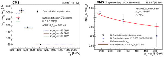 Running of the top quark mass. Left: Differential production cross-section measured as a function of compared to different choices for the top quark mass. Right: Extracted top quark mass running as a function of the process scale compared to one-loop SM RGE [46].