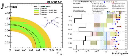 There is a rich landscape of searches carried out in the top quark sector, but despite this section, we are not discussing those searches in more detail here since there is a separate review on, e.g., vector-like top quarks. Instead, we only mention the ones most specific to top quarks, namely a hypothetical flavor-changing neutral current (FCNC). Recent searches for the existence of such an FCNC in top quark production or decay [143,144] is evident in the transition of an up or charm quark to a top quark, latest results are shown in Figure 17.