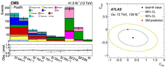 - Sirunyan, A.M.; Tumasyan, A.; Adam, W.; Bergauer, T.; Dragicevic, M.; Escalante Del Valle, A.; Jeitler, M.; Krammer, N.; Lechner, L.; Liko, D.; et al. Search for new physics in top quark production with additional leptons in proton-proton collisions at = 13 TeV using effective field theory. J. High Energy Phys. 2021, 3, 095. [Google Scholar] [CrossRef]