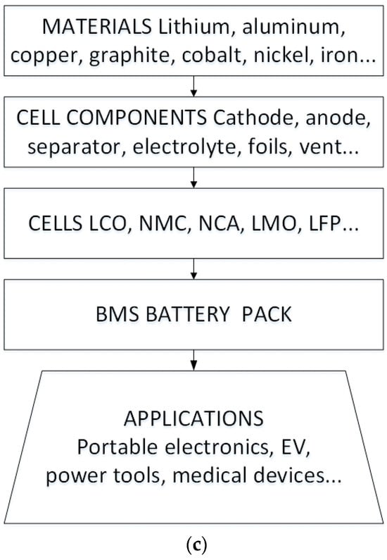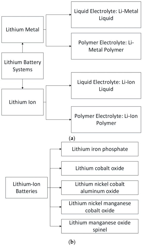 Lithium battery systems encompass a diverse array of configurations, as illustrated in Figure 1. Among these configurations, lithium-ion batteries emerge as a highly promising storage technology for reducing greenhouse gas emissions within the transportation sector. With their exceptional power and energy densities, lithium-ion batteries offer a well-suited solution for an extensive range of renewable energy storage applications. The inherent versatility of lithium-ion battery technology makes it adaptable to various usage scenarios, each with distinct specifications. In addition to their role in the renewable energy sector, lithium-ion batteries have gained significant traction in military, aerospace, and residential domains due to their exceptional safety profile, unwavering reliability, substantial power capacities, and extended operational lifespans [1,2,3]. The intricate interplay depicted in Figure 1 sheds light on the diverse technologies and applications seamlessly accommodated by lithium-ion batteries.