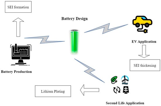 Presenting a comprehensive view of the battery’s journey, Figure 3 encapsulates the battery lifecycle. This encompassing trajectory begins with the production phase, navigates through intricate design considerations, and extends to second-life applications and the integration of electric vehicles (EVs). Thus, the profound impact of temperature fluctuations on lithium-ion batteries unravels a nuanced tapestry where diverse parameters and intricate interactions converge to shape the battery’s performance, longevity, and overall lifecycle.