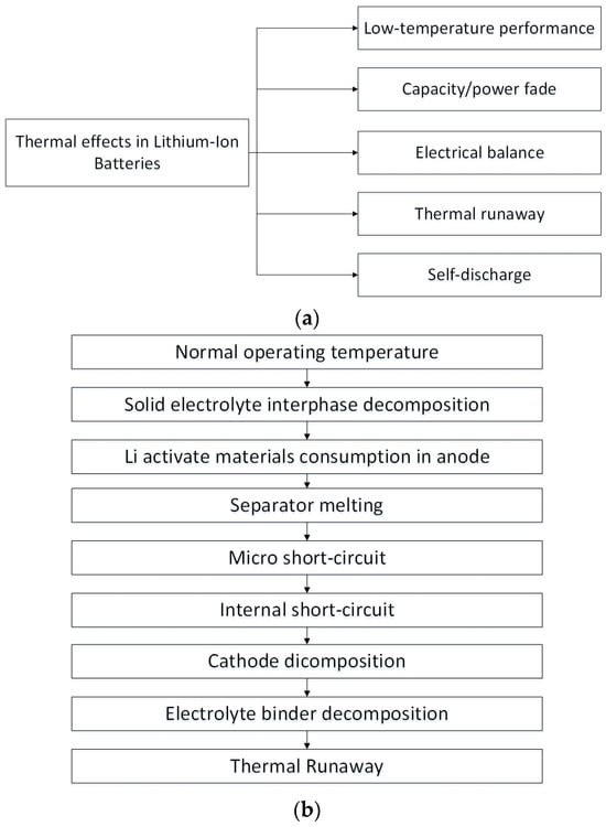 (a) Thermal effects in lithium-ion batteries [62], (b) Illustrative drawing of a conventional thermal runaway process [63].