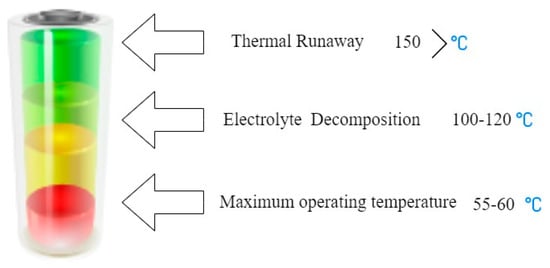 Figure 4 provides a comprehensive illustration of the thermal effects observed in lithium-ion batteries, accompanied by an informative portrayal of the conventional thermal runaway process inherent in these batteries [62,63]. Inadequate thermal management of lithium-ion batteries can lead to a phenomenon known as thermal runaway. Figure 4b offers a detailed depiction, elucidating the typical progression of thermal runaway in lithium-ion batteries. This process unfolds in distinct stages. During the initial phase, the solid electrolyte interface layer undergoes decomposition, triggering self-heating within the cell. This self-heating serves as a catalyst for subsequent reactions, ultimately resulting in the melting of the separator. Initially, this leads to a minor micro-short circuit, which then escalates into a more significant internal short circuit, intensifying self-heating and progressing to the second stage. In the second phase, exothermic reactions between the electrolyte and the cathode begin. The culmination of this escalating sequence occurs in the final stage, characterized by the decomposition of both the electrode and the electrolyte, resulting in a full-fledged thermal runaway [63].