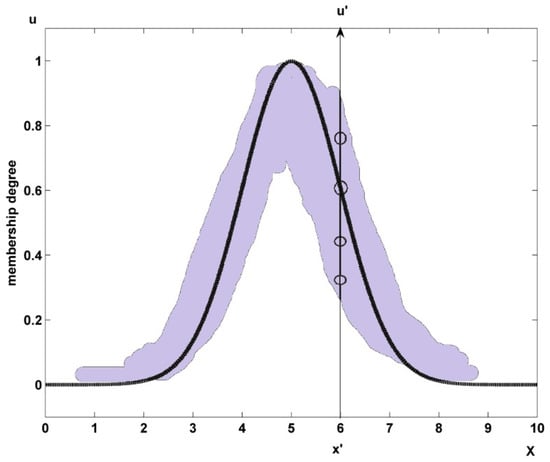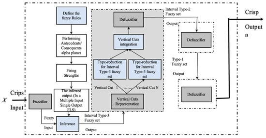 By comparing Figure 5 for type-3 with Figure 3 for type-2 fuzzy sets, we can notice that the most notable difference is in the type-reduction process, which involves using multiple fuzzy systems (corresponding to the vertical cuts) and then aggregating the results and defuzzification to obtain an interval type-2 fuzzy set. After this, the process is completed similarly to type-2, which is performed by reducing the fuzzy set to type-1 and then by performing traditional defuzzification to obtain a crisp number. Of course, all operations on type-3 fuzzy sets are an extension of the type-2 fuzzy operations; more details are outlined in the reference [26].