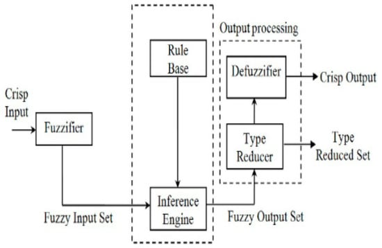 A typical structure of a type-2 fuzzy system is depicted in Figure 3. The output processor generates a type-1 fuzzy set output (from the type reducer) or a number (from the defuzzifier). This structure is similar to the one for type-1; however, the main difference lies in the utilization of type reduction for converting type-2 fuzzy sets into type-1 sets. Of course, all operations with type-2 fuzzy sets are generalized versions of their type-1 counterparts [24].