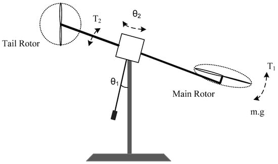 Air vehicles, such as airplanes and helicopters, have complex dynamics because of the nonlinear aerodynamic forces and uncertain effects of air flows. Therefore, the control of these vehicles is very difficult and is a challenge for any kind of controller [28]. The control systems’ design for stability of air vehicles is a very important topic. For flight control systems, Feedback Inc. designed a laboratory platform called twin rotor multi-input multi-output system (TRMS), which is illustrated in Figure 6. TRMS is similar to a helicopter, which has two rotors that are the tail rotor and main rotor, and the rotors generate, respectively, vertical (pitch angle) and horizontal torques (yaw) [28].