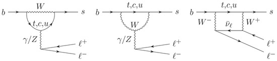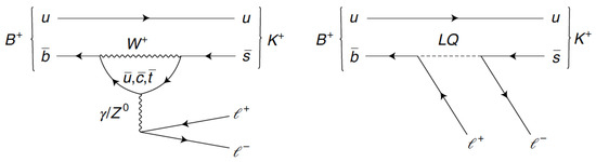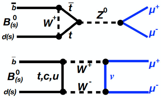 In the family of decays, there are the interesting decays of and . These decays have no tree-level contribution; rather, they can only occur via loop diagrams (Figure 7); thus, the expected branching fraction should be small. Further, these decays are also helicity suppressed, making them yet rarer. In the SM, the expected branching fractions of decay time-integrated branching fractions and are and , respectively. In recent years, significant advancements have been made in reducing the theoretical uncertainties associated with calculating branching fractions. These advancements can be attributed to progress made in lattice quantum chromodynamics (LQCD) [33,34], in the calculation of electroweak effects at next-to-leading order [35], and in the calculation of QCD effects at next-to-next-to-leading order [36].