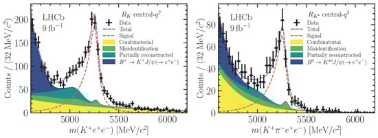 - LHCb Collaboration; Aaij, R.; Abdelmotteleb, A.S.W.; Abellán Beteta, C.; Abudinén, F.; Ackernley, T.; Adeva, B.; Adinolfi, M.; Afsharnia, H.; Agapopoulou, C.; et al. Tests of lepton universality using B0→ and B+→K*+ll decays. Phys. Rev. Lett. 2022, 128, 191802. [Google Scholar] [CrossRef] [PubMed]