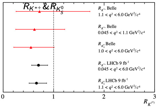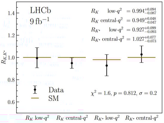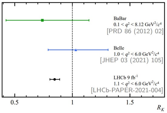 - Aaij, R.; Abdelmotteleb, A.S.W.; Abellan Beteta, C.; Abudinén, F.; Ackernley, T.; Adeva, B.; Adinolfi, M.; Adlarson, P.; Afsharnia, H.; Agapopoulou, C.; et al. Measurement of lepton universality parameters in B+→K+l+l− and B0→K*0l+l− decays. arXiv 2022, arXiv:2212.09153. [Google Scholar]
