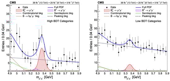 CMS collaboration measured the time-integrated branching fraction of the decays using both Run 1 and Run 2 data collected in pp collisions at the Large Hadron Collider (LHC) at CERN. The data correspond to integrated luminosities of 5 and recorded in the years 2011 and 2012 by the CMS detector at and , respectively, during the Run 1 data-taking period, and recorded in 2016 at = during Run 2 data-taking period. decay is observed with a significance of 5.6 standard deviations, and the branching fraction is measured as , where the last uncertainty refers to the uncertainty in the ratio of the and the fragmentation functions [37]. The highlights of this analysis were the usage of multi-variate techniques both for muon identification and candidate selection. The number of reconstructed events for the decays is obtained from the fits, and the efficiencies are used to obtain the branching fraction of the decay. The probability density functions (PDFs) obtained from simulated event samples, and data sidebands are used to perform the extended UML fit in the data (Figure 8).