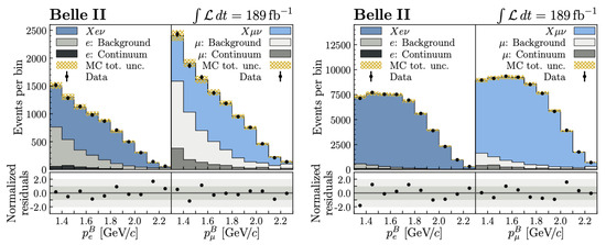 The first measurement of the inclusive branching fraction ratio was published by the Belle II collaboration. This measurement represents the most precise test of electron–muon universality in semileptonic B-meson decays up to the present time [42]. The Belle II collision data set was obtained during the period from 2019 to 2021, with a center-of-mass energy of . This energy level corresponds to the mass of the resonance, which predominantly undergoes decay into a pair of B mesons of opposite flavor. The integrated luminosity of the data set is , equivalent to approximately pairs.