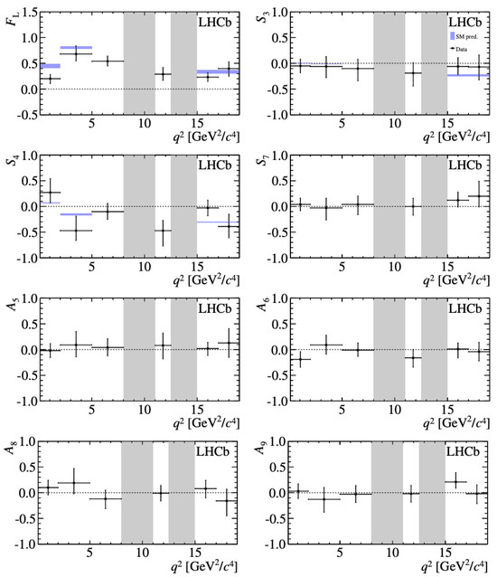 The angular distribution of particles generated in decays was analysed by LHCb. This analysis utilized data from the Run 1 data [25] and involved the measurement of angular parameters, namely the charge-conjugation parity (CP)-averaged observable . The measurement was conducted using an unbinned maximum likelihood fit. The measurement is conducted within specific ranges of dimuon invariant mass squared () to deliberately remove charmonium resonances and . The majority of observables exhibit a high level of concordance with the Standard Model. Nevertheless, a noteworthy level of stress () [25] is detected in . Other studies, like ATLAS [12] and Belle [14], have also observed a similar tension between theory and experiment, albeit with greater uncertainty. The study conducted by CMS [13] demonstrates agreement with the Standard Model (SM), while also being consistent with other experimental observations. The angular observable in decays in the bins dimuon invariant mass squared ( and from ATLAS [12], LHCb [26,27], CMS [13], and Belle [14] deviate at , , and from the SM expectations [28,29], respectively.