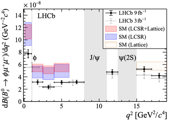 The measurement of the branching fraction of [44,45] in region by the LHCb collaboration has discrepancy at the level of (Figure 12) from the SM expectations [28,29].