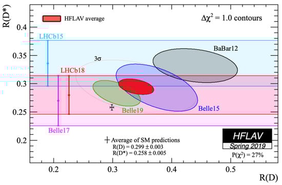 - Lees, J.P.; Poireau, V.; Tisserand, V.; Garra Tico, J.; Grauges, E.; Palano, A.; Eigen, G.; Stugu, B.; Brown, D.N.; Kerth, L.T.; et al. Evidence for an excess of B→D(*)τν Decays. Phys. Rev. Lett. 2012, 109, 101802. [Google Scholar] [CrossRef]
