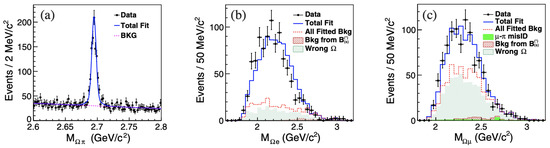 The fits to the (a) , (b) , and (c) distributions for the selected candidates from data [59]. Dots with error bars represent the data, solid lines are the best fits, and dashed lines are the fitted total backgrounds.