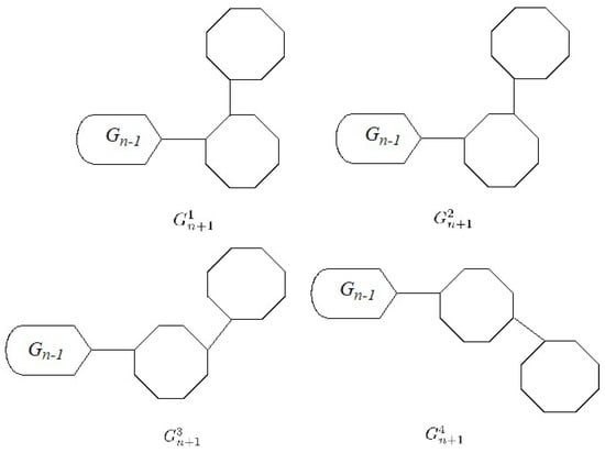Secondly, by appending a new terminal octagon to , the random cyclooctatetraene chain with n octagons can be constructed. We illustrates this process in Figure 2. As demonstrated in Figure 3, we can append the terminal octagon to with four methods and indicate the generated figures with , , , and , respectively.