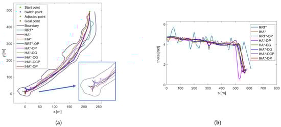 The paths generated by HA*, RRT*, IHA*, and their combinations with OP, CG, and OCP are shown in Figure 11, and the resulting orientations θ are shown in Figure 11b. Compared to RRT*, HA* and IHA*, all the methods with OP decreases the path length and relax the change rate of θ. Although HA* outperforms IHA* in terms of path length, its resultant path is closer to the boundary of the driving area, leading to increased driving risk. Compared to CG and OCP, OP could dynamically adjust the switching-back point and enhance the quality of the generated path. Table 4 shows that IHA*-OP achieves the shortest path length and computation time.