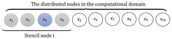 Suppose that and are arbitrary in which this node has a support domain with points inside its stencil. The FD scheme approximates the differential operator at a reference node by using the weighted linear sum of function values at all grid nodes into its stencil, in which the weighting coefficients at the stencil can be achieved as comes next: