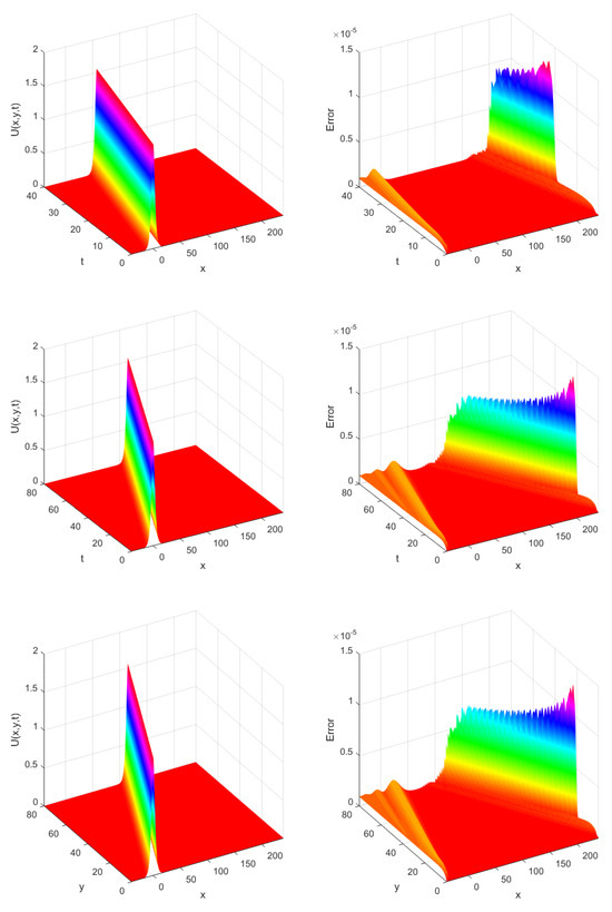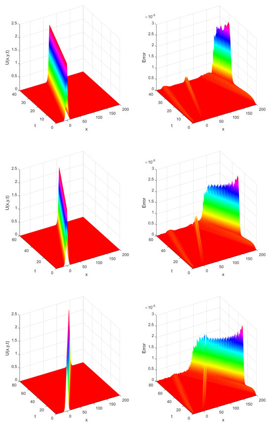 The approximation solution and corresponding maximum norm errors when , and over spatial interval for Example 3.
