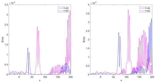 Consider the Kawahara-type Equation (6) with parameters as , and on the space interval so that the exact solitary wave solution is