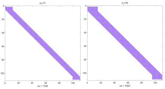 where the symbol denotes the weighted differences for the order derivatives and at every stencil. The matrices structure , , , and relies on the number of nodes in every stencil. For example, if we select three nodes at every stencil, then the matrices ,, , and are tridiagonal matrices.