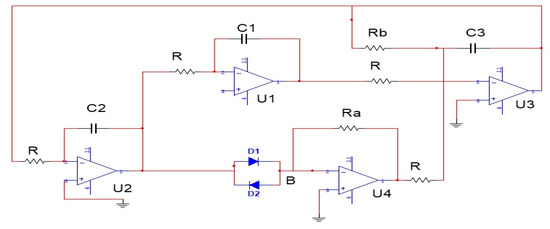 Figure 1 presents a graphical depiction of the electronic circuit encompassing the chaotic jerk system, which is essential in our research. Incorporating this circuit diagram plays a crucial role in facilitating the shift from abstract mathematical models to tangible applications within chaotic dynamics. Figure 1 and Equation (1) are inherently interconnected in our research. Equation (1) serves as the fundamental mathematical framework upon which our research is constructed, while Figure 1 represents the concrete manifestation of this equation as an electronic circuit. The correlation between theory and practice facilitates observing and manipulating chaotic phenomena inside the circuit system. System (1) is rescaled by using dimensionless variables and parameters given by , and . As a result, system (1) is rewritten as: