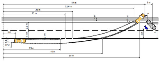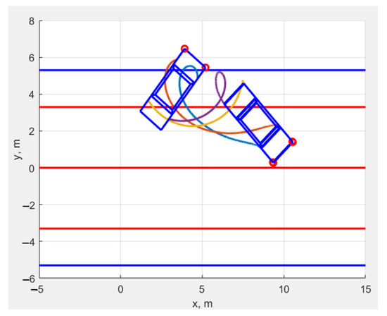 The coordinates of the vehicle’s center of mass at the time of initial contact before the deformation phase and the angle of rotation about the vertical axis of the vehicle, relative to the selected fixed coordinate system, are as follows: