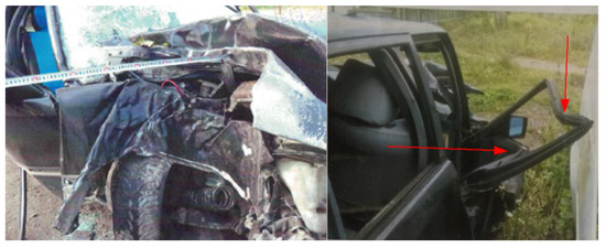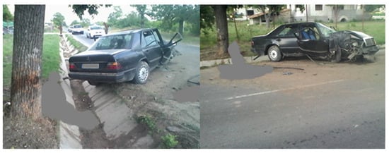 The characteristics and main signs of road accidents of such a type are the typical deformations from the contact of the car with the roadside tree relative to the symmetrically located car coordinate system. In the first phase of motion, the car has moved with relative transverse friction between the tires and the road surface, and the motion trajectory is arc-shaped. The car has crossed the entire traffic lane diagonally and what follows is an impact into the roadside tree (Figure 1 and Figure 2) [13,14,15,16].