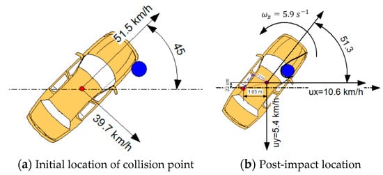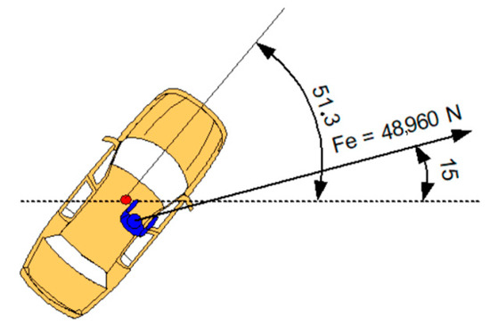 The right side of the equation represents the moment of the crash pulse relative to the car’s center of mass. The impact on the car is accompanied by a significant deformation in the lateral front right part as the impact force is in front–back and right–left direction relative to the vehicle’s own coordinate system.
