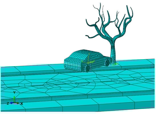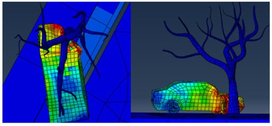 Detailed finite element modeling enables the development of a vehicle collision with a tree in the Abaqus/Explicit environment (Figure 7). In the model, the elements are separated into two levels—primary and secondary—which allows for meshing with lower density, compared to the usual one-level approach. The second-order tetrahedral element has 10 nodes (4 corner nodes and 6 internal nodes), each with three degrees-of-freedom. After the deformation, the edges and surfaces of the secondary elements are converted into curved shapes. Thus, the application of the chosen method, the curvilinear shapes, suggests an advantage over that of others and is justified.