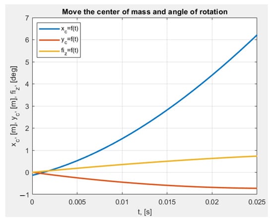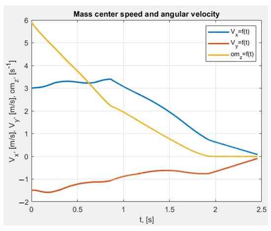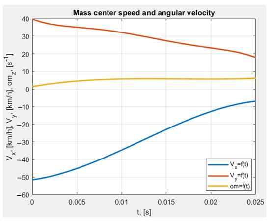 Figure 8 and Figure 9 show projection variations in velocity center of mass and angular velocity with respect to the vertical axis in the impact phase. For the impact time of 0.025 s, the values of the projections of the velocities, the angular velocity around the vertical axis, as well as the coordinates of the center of mass with the rotation angle towards the final phase of the impact, are as follows: