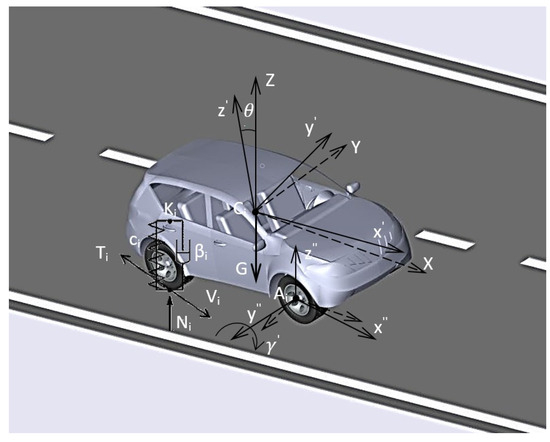 The stationary coordinate system is assumed to have an arbitrary origin relative to which the macromotion of the car is investigated. Two more coordinate systems are introduced for the dynamic study. The first one starts at point , denoted as , invariably connected to the car, parallel to the absolute coordinate system , and is displaced linearly and parallel to the absolute coordinate system. The second coordinate system has the same origin, respectively, point C, and is designated ; it is mobile and rotated at the angles (Figure 10) relative to the translationally moving .