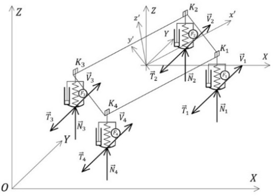 The gravity force is assumed to lie on the axis. The dynamic research model is a plane located in space, which is on four elastic supports, denoted by (Figure 11).