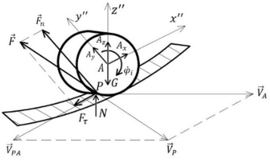 The analysis of the equations in the motion of the wheels takes into consideration the tangential friction force . This force is located in the plane of the road. Its direction is opposite to the direction of the velocity of the contact point. It changes its direction during velocity vector analysis.