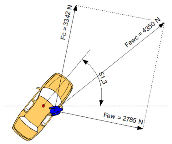 where τ is the time of impact; is the acceleration of the center of mass during impact; is the change in the speed of the car’s center of mass. This force component occurs first at impact and sharply decreases afterwards when maximum deformation is made. After impact, it ceases to act, and the dominant ones are the centrifugal force and the force from retarded motion.